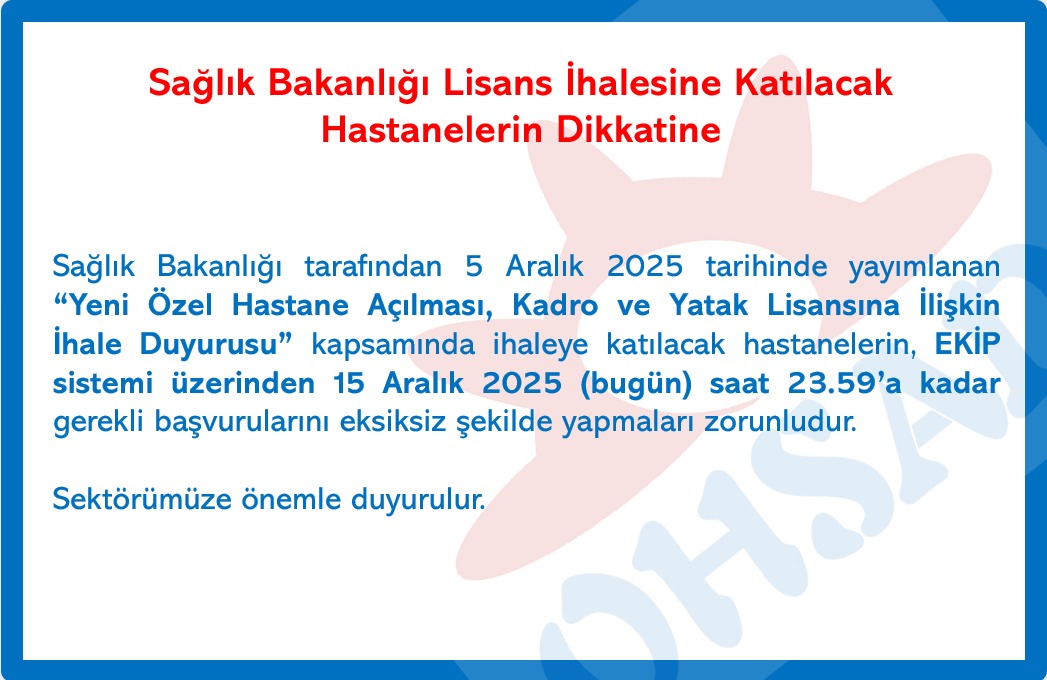 Sağlık Bakanlığı tarafından 5 Aralık 2025 tarihinde yayımlanan “Yeni Özel Hastane Açılması, Kadro ve Yatak Lisansına İlişkin İhale Duyurusu” kapsamında ihaleye katılacak hastanelerin, EKİP sistemi üzerinden 15 Aralık 2025 (bugün) saat 23.59’a kadar gerekli başvurularını eksiksiz şekilde yapmaları zorunludur.